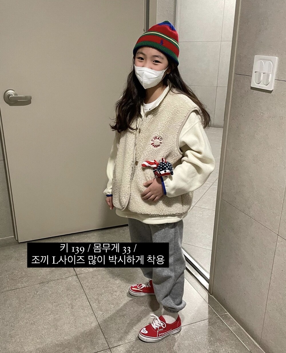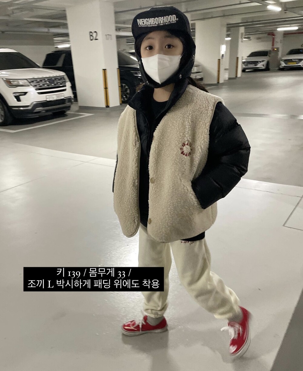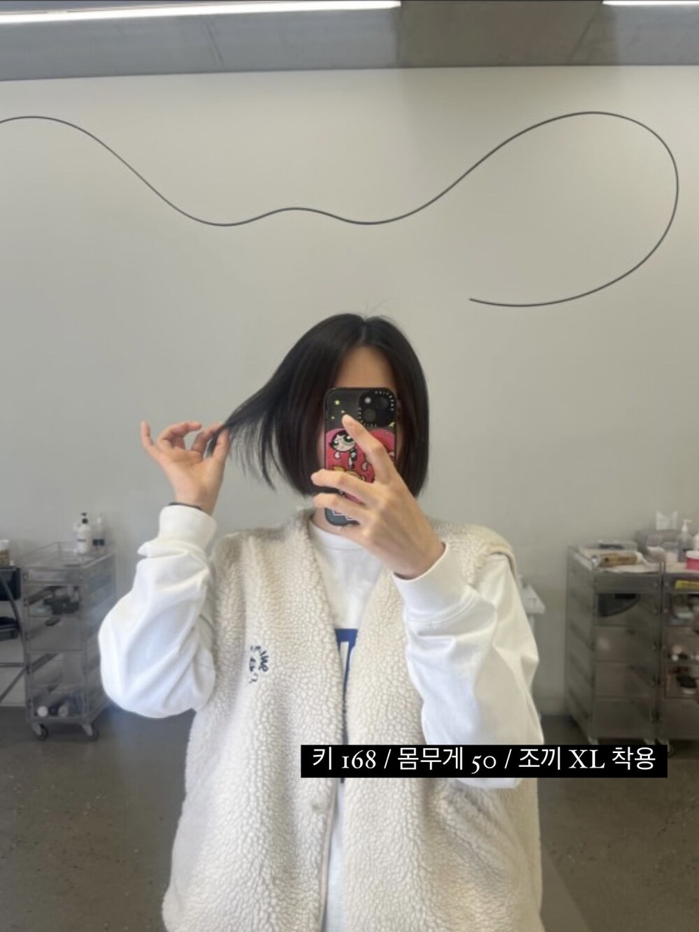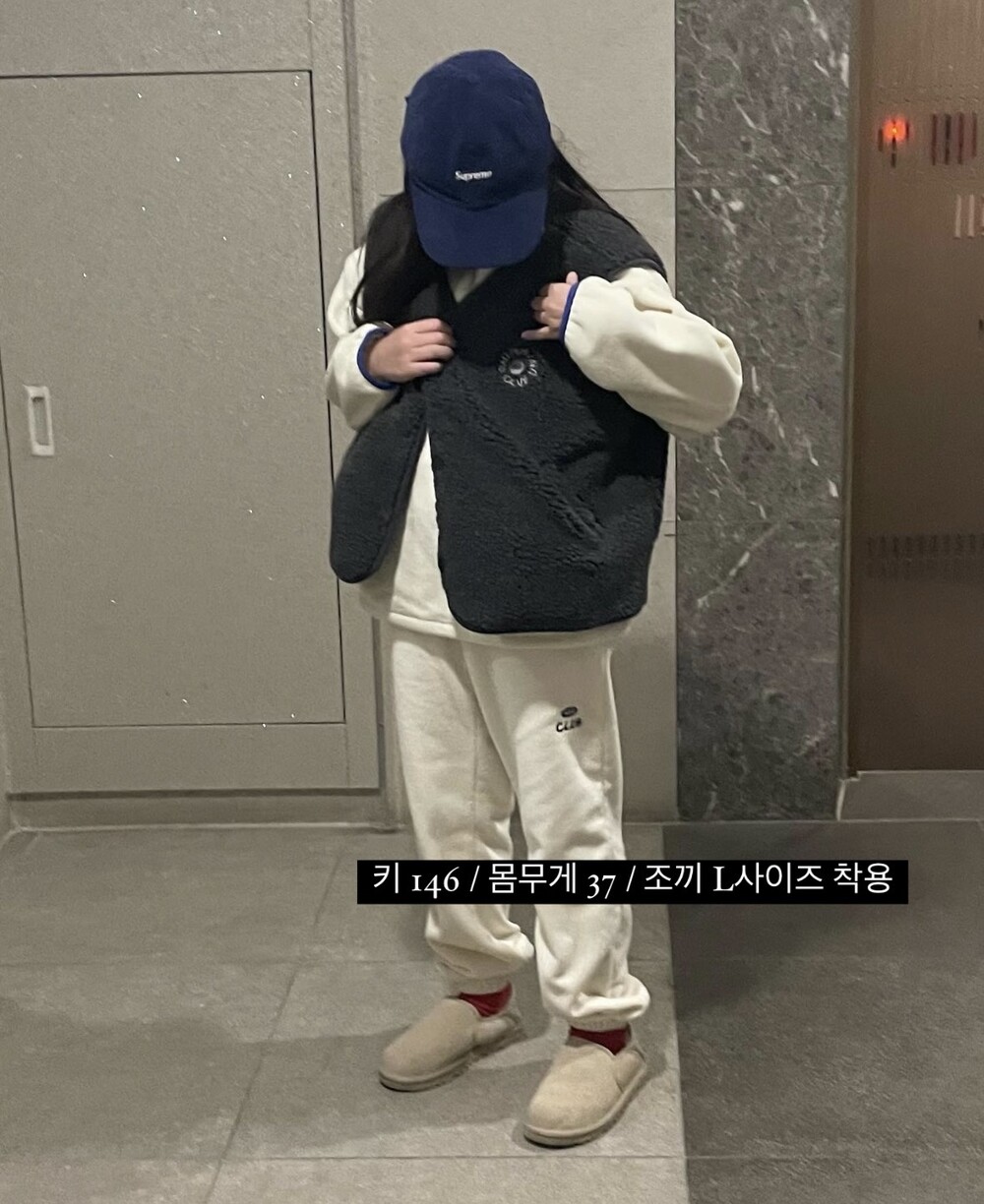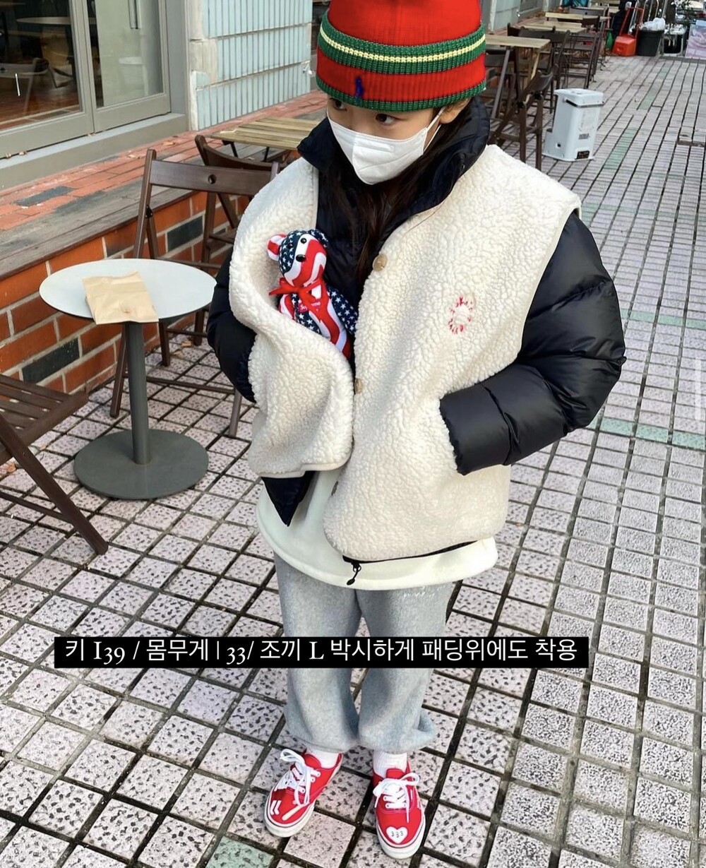 아이 키 153 / 몸무게 43/ 조끼 XL 많이 박시하게 착용