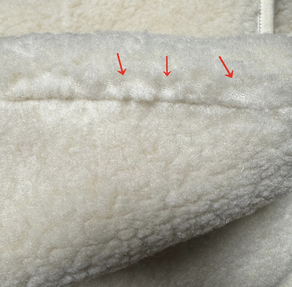 위에 사진처럼 덤블 원단이 봉제시에 털씹힘 현상이
